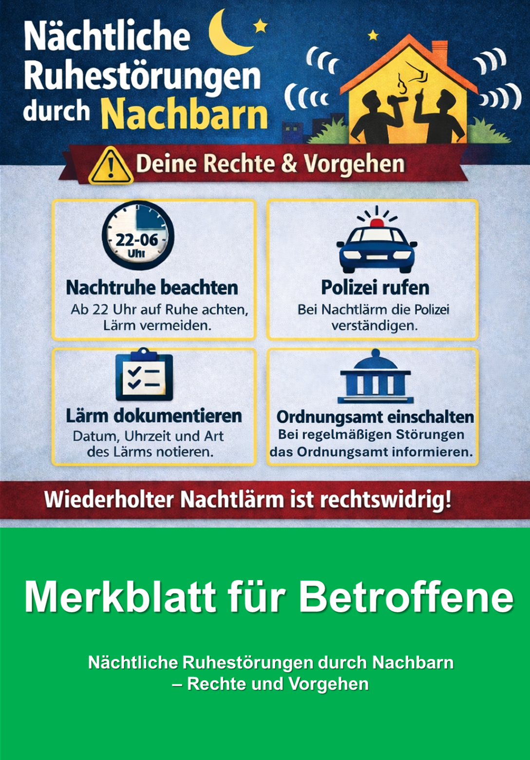Informationen zum Umgang mit nächtlichen Ruhestörungen, zu Ihren Rechten sowie zum richtigen Vorgehen finden Sie in unserem Merkblatt.