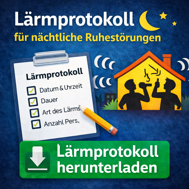 Mit dem Protokoll können Ihr Datum, Uhrzeit, Dauer und Art der Störung systematisch festhalten. Diese Dokumentation ist eine wichtige Grundlage, um Ruhestörungen gegenüber Behörden nachvollziehbar darzustellen und Maßnahmen anzustoßen.