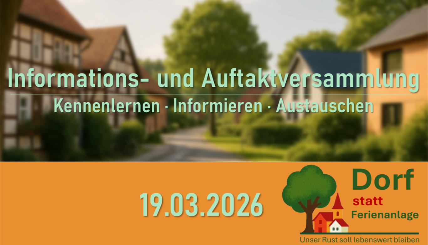Die Bürgerinitiative „Dorf statt Ferienanlage – Unser Rust soll lebenswert bleiben“ setzt sich für den Erhalt der Lebensqualität, des Ortsbilds und des sozialen Gefüges in Rust ein. Wir wenden uns gegen die zunehmende Bebauung für touristische Zwecke, die mit Ferienwohnungen, Tiny-Häusern und Parkplätzen den Charakter unseres Dorfes bedroht. Ziel ist es, die Interessen der Einwohner zu wahren, Grünflächen zu schützen, bezahlbaren Wohnraum zu sichern und eine gesunde Balance zwischen Tourismus und Lebensraum zu schaffen..