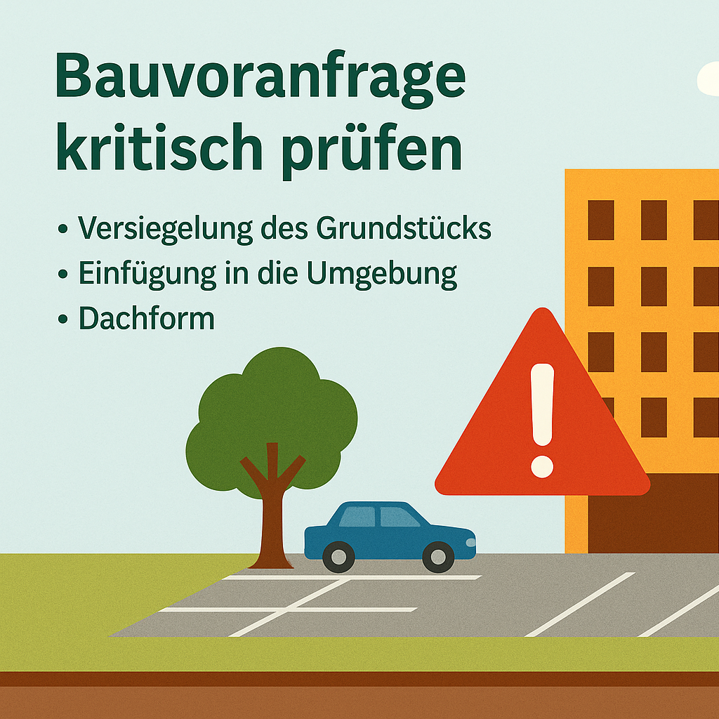 Wenn Sie mit einer Bauvoranfrage konfrontiert sind, die Ihr Grundstück oder Ihre Wohnqualität beeinträchtigen könnte, ist es entscheidend, frühzeitig und fundiert Einwände vorzubringen. Hier sind die wichtigsten Punkte, die Sie prüfen und beanstanden sollten, basierend auf den vorliegenden Informationen:
